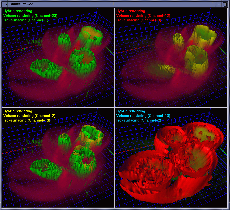 | Volume Visualization (VolVis) generally refers to the rendering of a scalar volumetric datset (possibly resulting from texture synthesis of a 3D vector / flow field). Based on the conventional Surface Graphics (in which an object is modeled by patched polygons on the surface --- empty inside), iso-surface techniques such as Marching Cubes [1], Dividing Cubes [2], and Marching Tetrahedra [3] work by fitting intermediate geometric primitives (e.g., triangles, Figure 1.a) to a threshold-defined 2D manifold prior to surface rendering (typically accelerated using commodity graphics cards and even Graphical Processing Units --- GPUs, Figure 1.b). Based on the increasingly established Volume Graphics (in which an object is modeled by solid volumetric elements --- voxels), direct volume rendering (volume rendering for short) techniques such as Ray Casting [4], Splatting [5], Cell-Projection [6], [7], [8], Shear-Warp [9], and hardware-based 2D / 3D texture mapping [10] eliminate the need for the construction of any intermediate representation, but instead operate on voxels by using a light absorption-emission model (used to approximate the interaction between light and the volume) and a transfer function (a map / transform used to emphasize or suppress part of the data from the rest) to assign colors and opacities (RGBA) to the voxels that are then sampled and composited or blended (through integral convolution) along the view direction (Figure 2). Volume rendering can also be implemented in the frequency domain [11], [12]. To provide a context for enhanced depth cueing and orientation, geometric objects such as arbitrarily-aligned clipping planes or surgical devices (e.g., scalpel) are sometimes rendered in combination with voxel-based volume data [13]. Iso-surfacing is good at displaying relatively simple or regular contour surfaces and at measuring surface area and volume, whereas volume rendering is well suited for delineating the distribution of some physical property (e.g., density, temperature, and pressure) within a dense volume and for representing amorphous transparent gel-like objects such as clouds, smoke, and fluid flows that are too complicated to be geometrically modeled using polygons. Hybrid Rendering incorporates iso-surfacing and volume rendering in the rendition of a single view and hence exploits the advantages of both. |