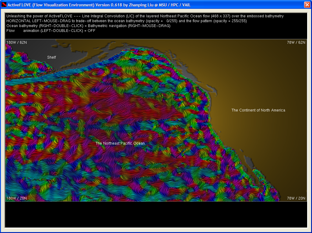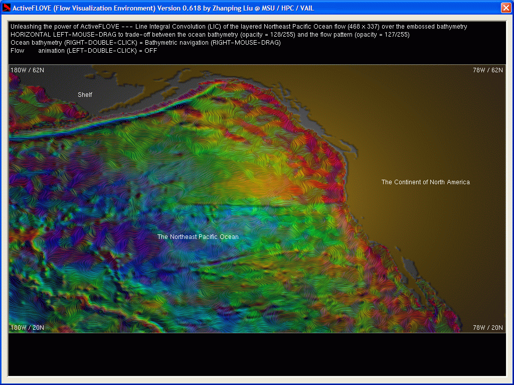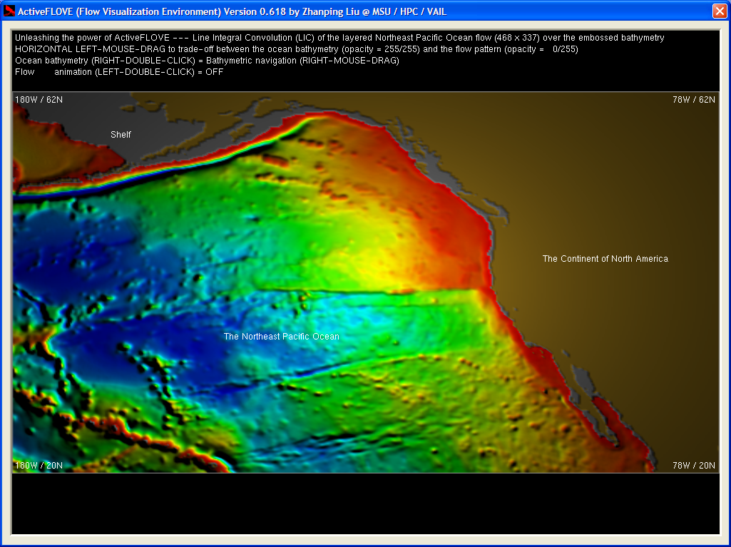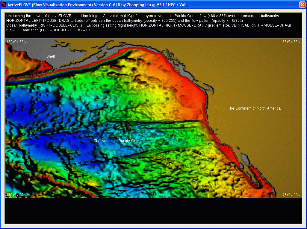 | The following snapshots demonstrate the use of ActiveFLOVE for LIC-based visualization of the layered Northeast Pacific Ocean flow. The underlying ocean bathymetry (depth of the ocean floor) and the continent of North America, both rendered through depth (or height for terrain) embossing, are shown in Figures 1 and 2. Embossing is a pixel-based / image-synthesis technique that can generate a 3D-like appearance (in the form of a curved surface) from an array of depth values (i.e., a 2D depth map) without explicit surface modeling by graphical primitives such as triangles. The basic idea is to reconstruct the surface by applying an illumination model (like the Phong model) to each grid point / pixel, at which the gradient (possibly magnified or minified to alter visual effects) is computed from the original depth values and is used as the normal. Given the viewing direction (perpendicular to the image plane) and typically a point light (and therefore its position --- the altitude over the image plane and the horizontal location --- governs the light direction for each pixel), a gray-scale value can then be easily obtained for each pixel. The gray-scale surface may be further color-coded to convey the depth information in a more intuitive way, e.g., with blue for deepest and red for shallowest. Figures 3 and 4 show the overall visual effects of placing a LIC texture of flow over the ocean bathymetry. Figures 5 shows three high-resolution images (1869 x 1009, 5.5MB) of the flow pattern. |