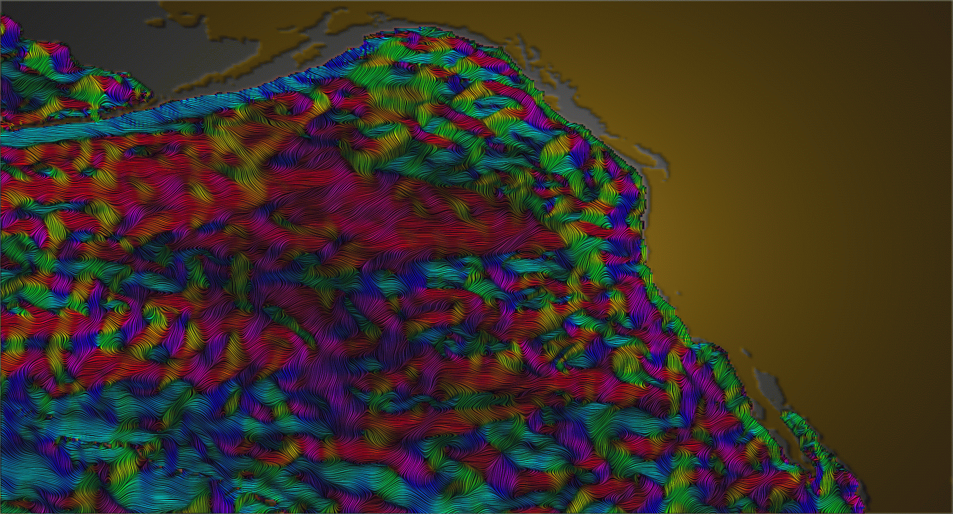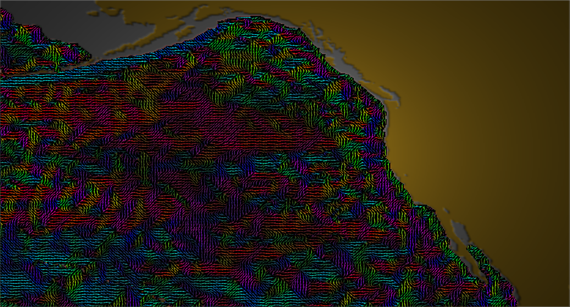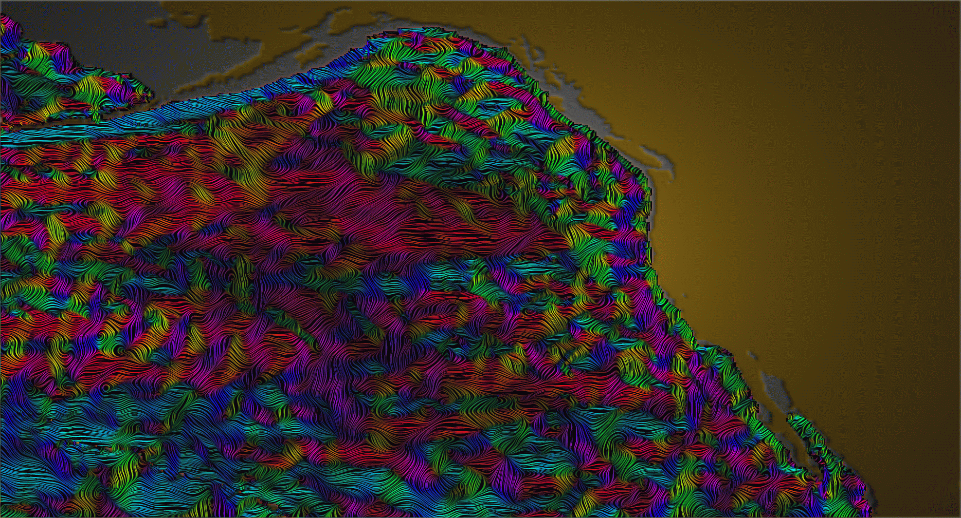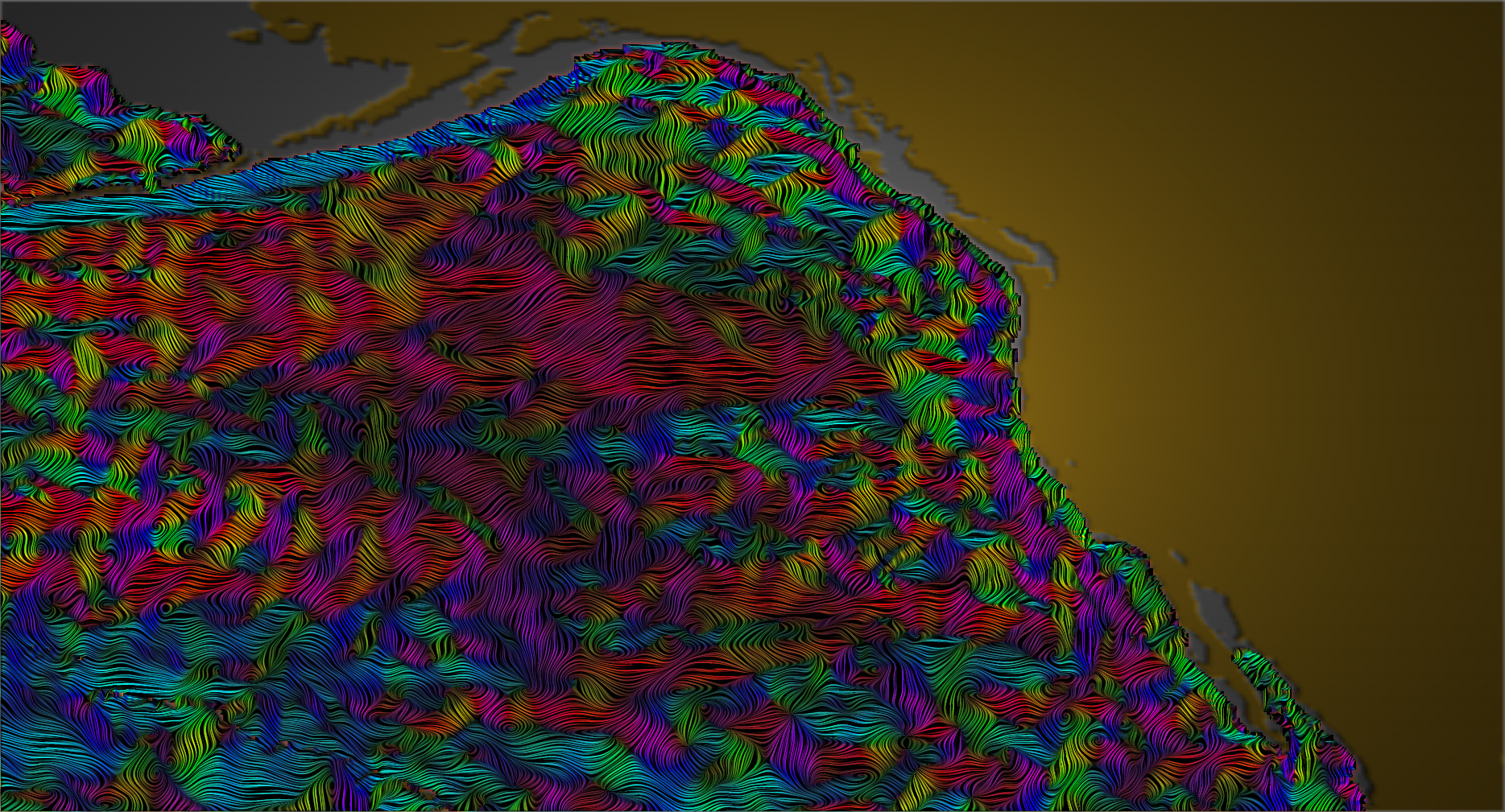 A fully opaque LIC texture of flow over the ocean bathymetry.