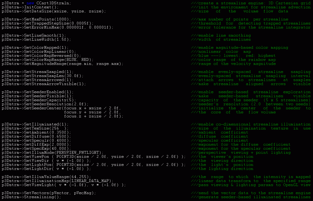 ActiveFLOVE (FLOw Visualization Environment), one of a series of Active'X' visualization systems (among others like ActiveLIC and ActiveIBFV) developed by Zhanping Liu at MSU / HPC / VAIL, is an OpenGL-based explorative flow visualization framework that can be exploited to facilitate the development of specific applications by assembling some of a large number of proprietary high-performance flow visualization components (including geometry-based and texture-based methods) and well-established general-purpose components (such as data processors, color mappers, image readers & writers, image processors, movie makers, to name only a few). These components are in the form of thoroughly-annotated but simply-structured C++ classes such that they can be easily called and updated. ActiveFLOVE originated from the observation that most flow visualization applications share many frequently-used stuffs such as OpenGL rendering context configuration, data processing (for histogram-based range transform, mask or context handling, and data interpolation), (rainbow / colorwheel) color mapping, image input / output (of BMP and EPS files), image processing (cropping / flipping / zooming / mirroring / low-pass filtering / high-pass filtering), matrix / vector computation (for quaternion rotation and vector normalization), and et al. The availability of such components in an easily-reusable self-inclusive (without the need to "#include" any other third-party libraries except for C / C++ standard ones --- otherwise a great deal of time would be wasted to search through complicated class hierarchies for even only a small piece of code and it would be very difficult to make some optimization or customization) form accelerates the development of an application and the implementation of a new idea. Thus ActiveFLOVE provides an efficient platform that enables rapid algorithm prototyping for test and demonstration purposes. One important goal of ActiveFLOVE is to offer an explorative experience from data visualization to the user. In particular, the user is just positioned deep into a data volume or a 3D scene to navigate through the flow, which is able to bring immersive look-and-feel to a WinTel desktop. |