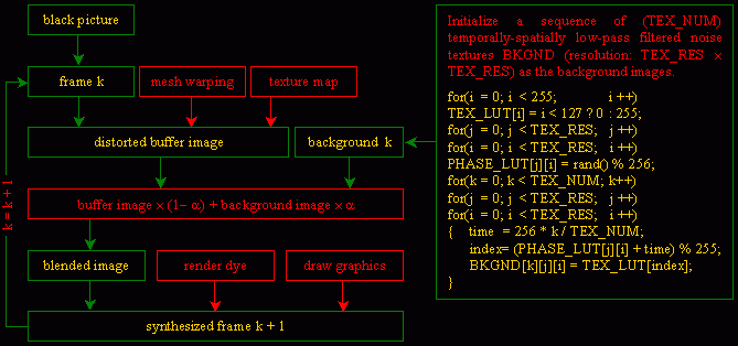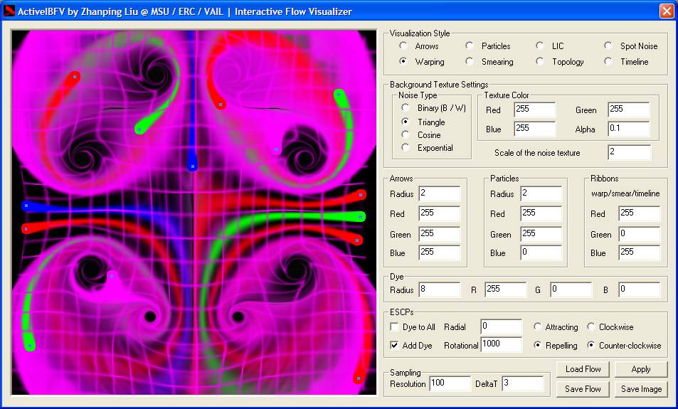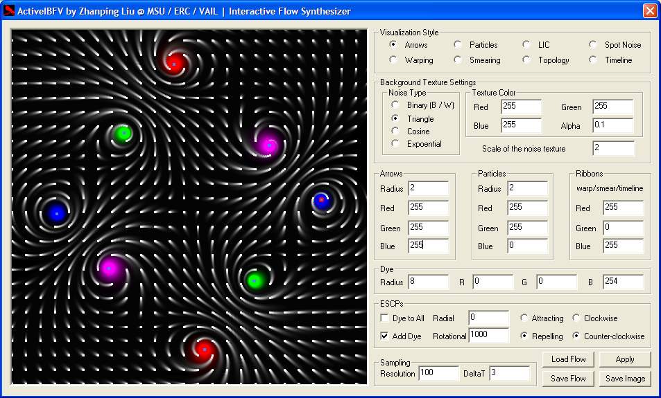 | ActiveIBFV, one of a series of Active'X' visualization systems (among others like ActiveLIC and ActiveFLOVE) developed by Zhanping Liu at MSU / ERC / VAIL, is a demonstration program of IBFV(Image Based Flow Visualization). In ACM SigGraph 02, Jarke J. van Wijk proposed IBFV [53] in which a sequence of temporally-spatially low-pass filtered noise textures are advected via forward texture mapping on warped meshes in combination with blending of successive frames (Figure 1). This easy-to-implement, efficient, versatile method can emulate a wide variety of flow visualization techniques such as arrow plots, particle tracing, timelines, topological analysis, spot noise, LIC, and dye advection / smearing at high frame rates using basic hardware features. In addition to this capability, interactive flow synthesis is supported by ActiveIBFV (Figure 2). |